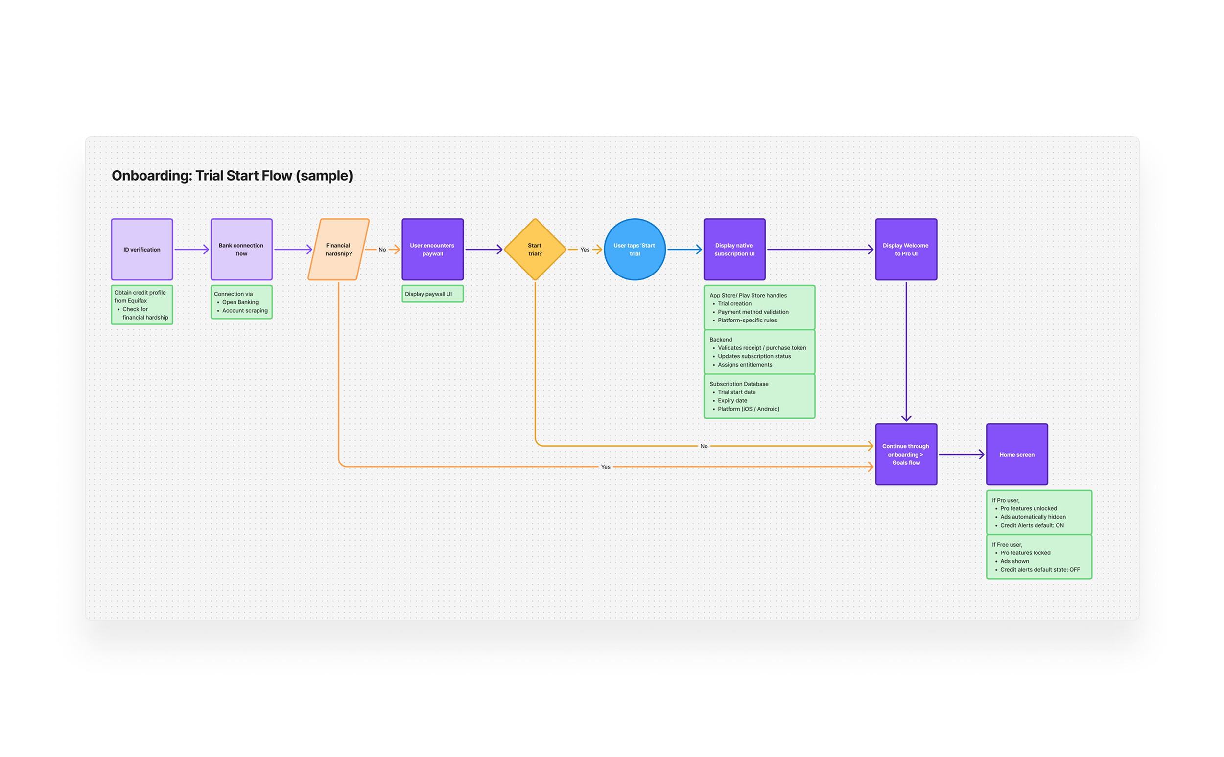Mapping user flows helped me understand the interactions between the user, the frontend and underlying systems like our subscription database, payments, and receipt validation.